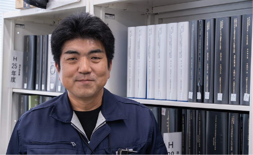 大栄コンサルタントに入社後、設計業務を中心にさまざまな仕事に携わってきた25年目のベテラン技術者。上司としての仕事への向き合い方、豊富な経験に基づく部下の育成や技術継承の考え方、技術者としての将来像について語ってもらいました。